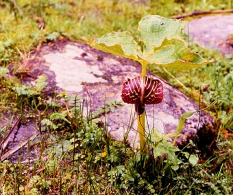 Voici une des plus impressionnantes espèces du genre, avec A.griffithii très proche. Cet arisaema a des très larges inflorescences recourbées, pourpres marbrées de blanc-crème, élargies sur le haut. Les pétioles des feuilles sont également fortement marbrés. Une plante époustouflante qui fleurit en mai-juin et atteint 40/50 cm de haut. Situation ombragée en sol frais, humifère et bien drainé. z6