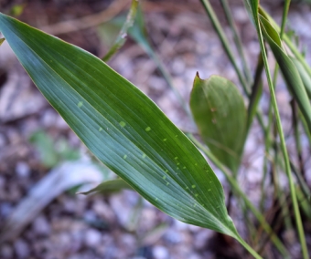 Aspidistra CBCH281 est issue d'une collecte que nous avions réalisé sur la montagne Emei dans le Sichuan en Chine. C'est une plante encore non identifiée aux grandes feuilles vert luisant parfois légèrement ponctuées de jaune-crème. Culture à l'ombre même très sèche. Rusticité mal connue, -12°C avec certitude mais probablement jusqu'à -15°C sans problème.
