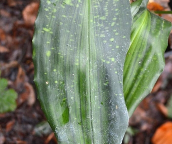 Aspidistra zongbayi 'Uan Fat Lady' se distingue par son feuillage hors du commun, vert foncé moucheté de vert clair avec une large bande également vert clair au centre du limbe, et qui se positionne presque horizontalement. Fleurs pourpres à cœur blanc qui tapissent le sol au pied de la plante en été ou début d'automne. Bonne rusticité : -10°C voire en dessous