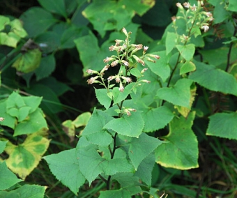 Plante vivace d'ombre ou mi-ombre et terre fraiche, ce Cacalia sera surtout planté pour ses étranges feuilles largement triangulaires, très décoratives. En été, ses petites fleurs apparaissent en haut des tiges. La plante atteint environ 50cm de haut à la floraison.