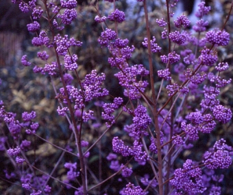 Arbre aux bonbons. Arbuste chinois à beau feuillage vert avec, en été, une multitude de petites fleurs rose-violacé. Son intérêt principal se situe en automne où l'arbuste se couvre de fruits violet vif. Un réel décor en automne et début d'hiver qui persiste après la chute des feuilles aux premières gelées. Le feuillage prend de belles couleurs d'automne. Callicarpa signifie 'jolie baie' en grec. Hauteur adulte : 1 à 2 m. Soleil ou mi-ombre, arbuste facile.