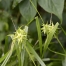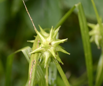 Un grand carex aux feuilles plissées vert tendre, dont l'intérêt réside surtout dans sa floraison et fructification en forme de grosse étoile - massue à clous.