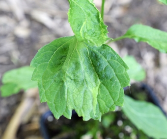 'Sankou Nakafu' est une variété japonaise aux fleurs plus roses et aux feuilles variablement marquées de vert clair et vert foncé et de formes irrégulières.