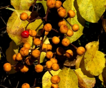 Une plante grimpante chinoise de la famille des Fusains, très intéressante en automne pour sa fructification bicolore (rouge et orange) et la couleur de son feuillage qui vire au cuivre jaune.