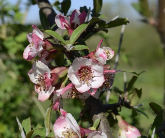 Chinese quince tree. Makes a lot of white beautiful pinkish white flowers in spring. Big and perfumed green fruits in falls. Grows in all good soil, in sun or part-shade. Can reach 2 to 3 meters high.