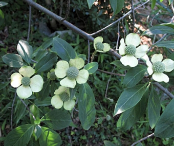Voici un superbe cornouiller himalayen formant un grand arbuste (voire un petit arbre en bonnes conditions) dont le joli feuillage persiste toute l'année. Au printemps, sa floraison est spectaculaire. Ses petites fleurs en boules, sont entourées de 4 grandes bractées blanc-crème à jaune pâle très ornementales. Elles sont suivies de fruits rouges comestibles lorsqu'ils sont bien mûrs. Il peut atteindre 4 à 5 m de haut chez nous. Ce cornouiller est moyennement résistant au froid et il est donné pour résister à -10°C environ. Notre pied-mère a déjà subit -15°C à plusieurs reprises en situation abritée contre un mur. En tout cas, il est à réserver aux régions pas trop froides.