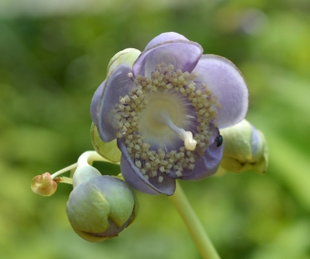 Handsome shade perennial related to hydrangea. Pale blue flower