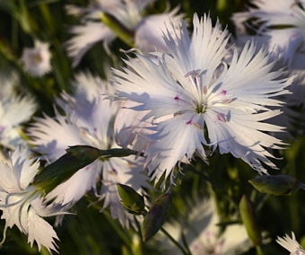 Oeillet à port compact et rampant de 15/30 cm de haut. Ses feuilles fines sont argentées. Il se couvre de fleurs blanchestrès parfumées en mai-juin. A planter au soleil, dans une rocaille, en massifs, en auge...