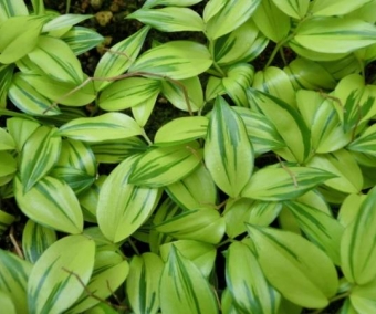 Disporum smilacinum est une jolie petite plante des sous-bois du Japon qui forme de beaux tapis. Floraison blanche en clochettes, au printemps. Cette variété japonaise est très lumineuse avec ses feuilles largement marquées de jaune vif. Culture facile en sol pas trop sec et bien drainé. Le prix comprend un ehizome.
