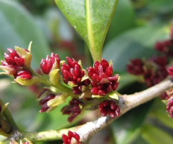 Arbuste de la famille des hamamélis aux jolies petites feuilles oblongues, entières, vert foncé et persistantes. Au début du printemps, nombreuses petites fleurs rouges tout le long des rameaux. Port gracieux et élégant. Ce rare arbuste chinois sera planté à mi-ombre ou au soleil non brulant, dans toute bonne terre de jardin, à l'abri des vents froids. Si il devient un arbuste assez haut dans son milieu naturel, sa croissance lente, où il pourra atteindre entre 1 et 1.5m de haut. Rusticité de l'ordre de -15°C environ.
