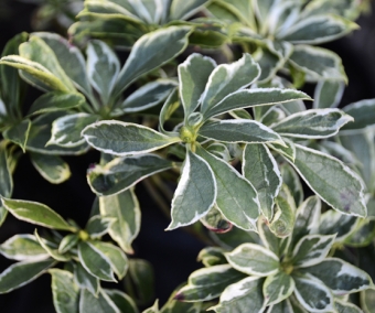 'White Elegans' est une variété lumineuse aux feuilles bordées de blanc. Un feuillage très beau à l'ombre. Fleurs blanc pur au printemps. Plants de 40/50 cm.