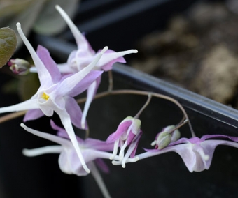 Encore un très bel hybride japonais, qui séduira tout particulièrement les amateurs d'Epimedium à grandes fleurs éperonnées et bicolores : roses à l'extérieur et blanches au coeur, elles s'épanouissent au dessus des feuilles et s'ouvrent bien en étoiles.