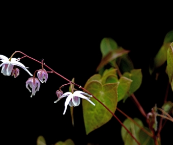 Variété à feuillage caduque, très arrondi, teinté de rouge au printemps. Grandes fleurs blanches teintées de rose. Forme une touffe compacte de 30 cm environ en tous sens. Culture en situation ombragée.
