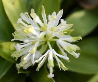 Heloniopsis orientalis est une jolie plante compacte à feuilles vertes groupées en rosettes. Au printemps, émergent du centre des rosettes, des inflorescences de fleurs blanches pour cette variété. Une plante élégante, de 10 cm de haut environ, que j'aime beaucoup. Culture au soleil si sol toujours frais ou, mieux, à mi-ombre, en sol frais. z6. Belles divisions en age de fleurir.