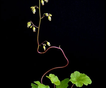 Une petite heuchère botanique orginaire de Californie, aux feuilles vert tendre, dentées et aux petites fleurs en clochettes blanches s'épanouissant en été.