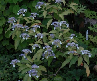 Un bel hortensia chinois, rare, à longues feuilles dentées et velues. En été, belles inflorescences aplaties de fleurs fertiles bleues (au centre) entourées de quelques fleurs stériles blanches. Culture à l'ombre ou mi-ombre, taille adulte de 1 à 1.5 m environ. Les plants proposés mesurent environ 30 cm.