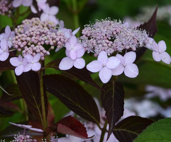 Très belle variété aux nombreuses inflorescences bleutées en juin-juillet. Celles-ci contrastent bien avec le jeune feuillage fortement teinté de pourpre. Cet hortensia atteint environ 1m de haut. Plants de 30/40 cm.