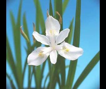 A charming woodland iris from Japan with grassy leaves and showy flowers in Spring. This is the white form; we also offer the purple flowered wild form. Great trough or rock garden subject or as a small-scale groundcover. Easy