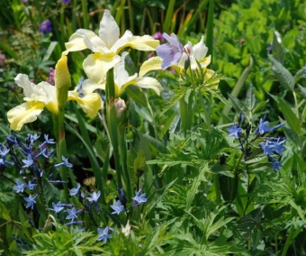 Une belle sélection d'Iris sibirica aux inattendues couleurs jaune pâle et blanche.