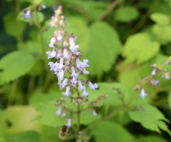 Isodon umbrosus var.hakusanensis a de larges feuilles arrondies dont le sommet est profondément et irrégulièrement découpé. Elles ont une forme très originale et décorative et font penser aux feuilles des urticacées japonaises. La plante est donc décorative toute la saison même en dehors de sa période de floraison. En septembre-octobre, ses longues inflorescences se couvrent de fleurs mauves. z6. Nos plants sont issus de graines collectées au Japon. Plants livrables à partir de début septembre 2016, quantité limitée.