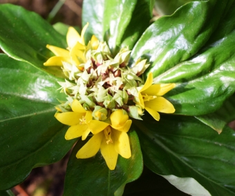 Lysimachia paridiformis est vraiment à part et différente des autres espèces. Elle est assez petite, de 20 à 40 cm de haut environ. Elle a des tiges qui portent 4 à 10 feuilles qui sont groupées au sommet. Celles-ci sont épaisses et persistantes. Les fleurs jaunes apparaissent au centre des feuilles en fin de printemps et début d'été, en inflorescences denses. Une plante de sous-bois sombres qui n'est pas très rustique. Culture en sol frais à pas trop sec, humifère, à l'ombre. Pour les climats doux ou en serre froide, jusqu'à -12°C environ. z8. Nos plants sont issus de graines collectées sur le mont Emei dans le Sichuan en Chine.
