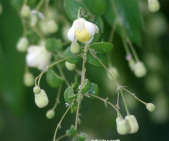 Quelle superbe espèce ! Voici un mahonia très rare en culture aux longues feuilles composées de folioles dentées. Quelle grâce il a ce mahonia originaire du Mexique. Il peut atteindre 3 mètres de haut. Son feuillage est composé de folioles assez allongées et finement dentées. Mais c'est sa floraison qui est vraiment spectaculaire. Il a de longues inflorescences ramifiées, retombantes et donc très gracieuses. Ses fleurs sont blanc crème, teintées de rose à l'extérieur. Il fleurit en fin d'hiver et peut refleurir en automne. Les fleurs sont suivies de baies noires. Je ne connais pas encore sa rusticité exacte et il sera à planter à l'abri des vents froids dans les régions froides. Il est donné pour la zone 8. Plants de 40 cm environ.