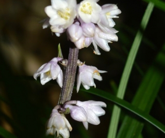 Petite plante vivace à feuilles très fines. Floraison blanche automnale en épis, suivie de baies bleues décoratives.