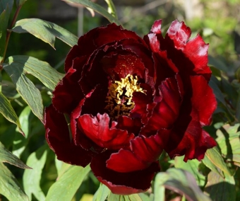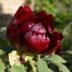 Une superbe pivoine arbustive japonaise, aux fleurs couleur bordeaux, semi-doubles, parfois maculées de blanc sur les pétales externes.