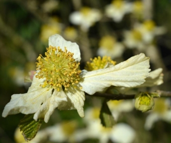 Un grand arbuste (ou petit arbre) très appréciable pour sa floraison très précoce -dès mi-mars, juste avant le débourrement du feuillage - et bien différente des autres espèces de la famille (Hamamelidacées). En culture, il atteint environ 2 m de haut en plusieurs années puis 3 à 4 m une fois adulte. Ses véritables fleurs sont en réalité minuscules mais rassemblées en têtes rondes bien visibles et, surtout, entourées de grandes bractées blanches ressemblant à des pétales. On a l'impression que l'arbuste porte de grosses fleurs blanches à coeur jaune.