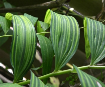 Polygonatum falcatum est une grande et belle espèce pouvant atteindre 80 cm de haut ou plus avec des tiges portant de nombreuses feuilles allongées. En mai-juin, les tiges portent des fleurs pendantes, blanc-verdâtre, de 2 cm de long. Une très belle espèce, graphique, intéressante pour donner de la hauteur dans les massifs. z6