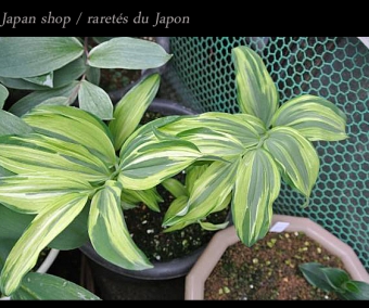L'horticulture japonaise est très dynamique. Les japonais sont, notamment, fous de feuillages panachés, d'orchidées terrestres, de fleurs doubles ou bigarrées. J'ai toujours le souvenir de ces pépinières au Japon pleines de plantes de différentes couleurs. L'intérêt des japonais pour les plantes panachées demeure aujourd'hui fort mais n'approche pas ce qu'était il aux 18° et 19° siècles, quand la création de ces plantes semble avoir été presque une préoccupation nationale. Ces plantes, aussi bien que celles sélectionnées pour les fleurs voyantes ont été développées dans des pots et individuellement admirées plutôt qu'en tant qu'élément d'un paysage de jardin. On voit d'ailleurs beaucoup au Japon de plantes cultivées dans de petits pots en terre cuite. La plupart de ces plantes ne sont jamais sorties du Japon et les autres restent pour beaucoup uniquement cultivées dans de très rares collections. Il faut dire que certaines variétés peuvent dépasser les 100 euros le godet ! Depuis plusieurs années, nous développons notre collection et vous retrouverez dans cette rubrique, celles qui sont encore très rares et que nous proposons bien souvent qu'à l'unité. D'autres variétés, multipliées maintenant en plus grand nombre, sont intégrées à notre catalogue général.