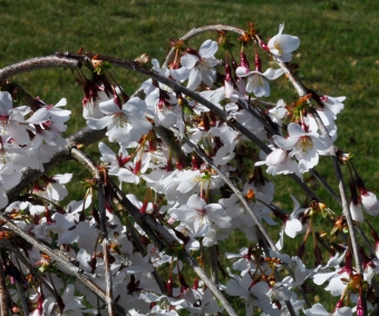 Superbe cerisier à fleurs du Japon, pleureur, qui se couvre littéralement d'abondantes fleurs simples blanches en fin d'hiver-début de printemps, avant l'apparition des feuilles. Le feuillage présente une belle coloration rouge en automne. Mis en valeur en isolé ou en léger surplomb, ainsi qu'en bord d'eau.