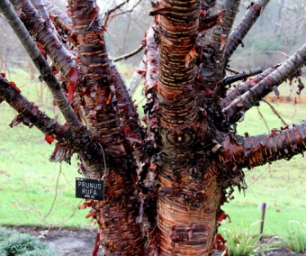 Prunus rufa, tout comme P.serrula est un champion du genre en matière d'écorce. Celle-ci est marron foncé et très brillante. C'est un petit arbre de 4/5 m environ qui se présente souvent en cépée. Magnifique en isolé près de la maison. Ses fleurs rose pâle apparaissent en avril. Plantation au soleil, dans toute bonne terre de jardin, même caillouteuse. Ne craint pas le sec. z6. Plants de 1m environ, conduit en jeune cépée.