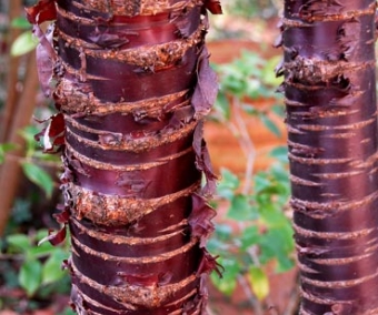 Prunus serrula est sans doute le champion du genre en matière d’écorce. Celle-ci est marron foncé et très brillante. C’est un petit arbre de 4/5 m environ qui se présente souvent en cépée. Magnifique en isolé près de la maison. Ses fleurs blanches apparaissent en avril-mai. Plantation au soleil, dans toute bonne terre de jardin, même caillouteuse. Ne craint pas le sec. z6. Plants de 60/80 cm environ. Livraison à partir de mi- à fin février selon météo.