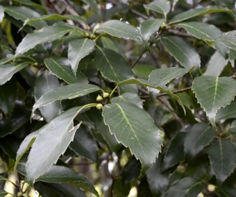Autre chêne à feuillage persistant formant un arbre petit à moyen. Ses jeunes feuilles sont fortement colorées de rouge puis elles deviennent vertes dessus et glauques dessous. Glands de 1/1.6 cm environ. Plants proposés en 40/50 cm.