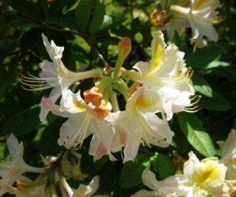 Un petit rhododendron caduc des montagnes froides du Japon. La plante est de taille modeste, environ 1 m de haut. Au printemps, au moment où les nouvelles feuilles sortent, des bouquets de fleurs apparaissent au bout des tiges. Celles-ci sont naturellement jaunes, orange ou roses. Soleil ou mi-ombre, dans toute bonne terre de jardin. Tolère le plein soleil.