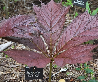 Rodgersia podophylla 'Aka Ba' est une variété japonaise qui peut atteindre 1.5 m de haut au moment de la floraison. Ses jeunes feuilles sont fortement teintées de pourpres au printemps. Elles sont composées de folioles échancrées et dentées au sommet. z5