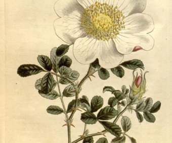 Le rosier de Macartney (Rosa bracteata) est une espèce de rosier originaire du sud de la Chine, de Taïwan et du Japon. Rosa bracteata est un arbuste qui peut atteindre 2 à 3 mètres de haut. Les feuilles persistantes sont composées de 5 à 9 folioles elliptiques de 2 à 5 cm de long, au bords crénélés. Les fleurs blanches, soyeuses, simples, de 5 à 7 cm de diamètre, sont généralement solitaires. Leur centre, jaune orangé, est formé de très nombreuses étamines. Elles exhalent une odeur de citron. Le calice est entouré de grandes bractées foliacées vertes, d'où l'adjectif spécifique bracteata. La floraison est longue. Les cynorrhodons ont 3 cm de diamètre environ. Nos plants sont issus de graines collectées au Japon. Un beau rosier avec une belle fructification, à cultiver au soleil dans un sol bien drainant.