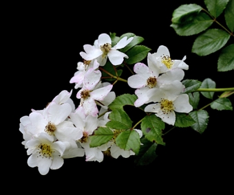 Rosa fujisanensis est un rosier japonais à longues branches retombantes pouvant être traité comme un large arbuste ou comme un grimpant de 3 m environ. En mai-juin, il a de nombreuses fleurs blanches, simples, de 2/3 cm, parfumées. Soleil ou mi-ombre. z6. Nos pieds-mères sont issus de graines collectées au Japon.
