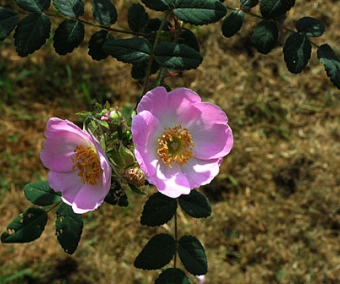 Un rosier arbustif originaire des montagnes de l'ouest de la Chine. Il a plusieurs intérêts : ses fleurs roses et simples en coupes, ses jeunes tiges couvertes de grosses épines rouge vif et ses fruits orange très décoratifs en automne. De taille modeste, il atteint environ 1.5 m de haut. Culture facile au soleil. Quantité limitée.