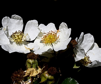 Il est toujours très sain, à floraison assez tardive (milieu d'été), et se couvre de petites fleurs simples blanches légèrement parfumées, visitées par les abeilles. Assez épineux, livré à lui-même il atteint 30-40 cm de haut et s'étale sur 3-4 m environ en tous sens. Puis suivent des petits cynorrhodons rouges.