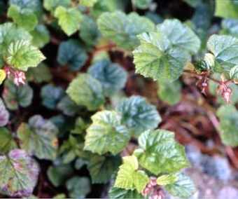Un Rubus chinois parfait en couvre-sol, aux tiges velues rougeâtres et aux feuilles assez coriaces d'un très beau vert foncé lustré.