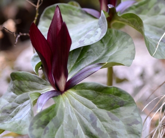 Trillium kurabayashii a de grandes feuilles tachetées. Ses fleurs ont de longs pétales pourpre foncé. Je suis toujours étonné de voir cette plante pointer le bout de ses feuilles dès le mois de janvier. Et malgré les grands froids, cela ne les empêche pas de finir de sortir en mars. Une espèce belle et facile qui peut former des touffes de 50 cm de haut par autant de large. z6.