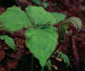 Voici une des plus impressionnantes espèces du genre. Cet arisaema, originaire des hautes montagnes de l'Himalaya, a de larges inflorescences recourbées, brun-pourpre nervurées de plus clair. Les pétioles des feuilles sont également fortement marbrés. Une plante époustouflante qui fleurit en mai-juin et atteint 40/50 cm de haut. Situation ombragée en sol frais, humifère et bien drainé. z6. Bulbes en age de fleurir.