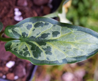 Une forme particulière de l'Arum italicum des sous-bois et lisières, aux feuilles fortement argentées, surtout au centre, très décoratives. le feuillage sort en automne et reste persistant en hiver.