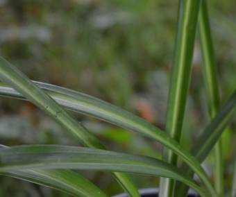 Aspidistra linearifolia est une plante dont les longues feuilles sont très étroites. Elle pousse lentement et forme une touffe serrée et peu étalée. Ses fleurs sont pourpres. z8 'Skinny Dippin' a des feuilles avec une bande blanc-crème au milieu. Une plante très élégante. Rustique jusque vers -10°C environ.
