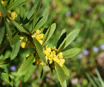 Belle espèce aux longues feuilles persistantes et coriaces. Au printemps, nombreux bouquets de fleurs jaune vif suivies de fruits bleu-noir. L'arbuste atteint entre 1 et 2 m de haut. Plantation au soleil ou à mi-ombre, dans toute terre de jardin. Plants de 30 /40 cm, quantité limitée.