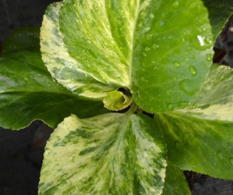 Un bergenia + qu'original avec sa belle panachure. Aussi facile à cultiver que le classique bergenia cordata si ce n'est qu'on lui préferera un emplacement à ombre légère plutôt que le plein soleil, surtout aux heures les plus chaudes.