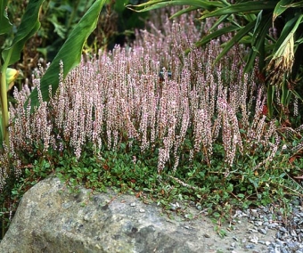 Un petit couvre-sol bas de la famille des Polygonum et autres Persicaria. feuilles de moins de 1 cm, portées sur des tiges rampants au ras du sol, floraison en petits épis dressées blanc virant au rose en fanant.