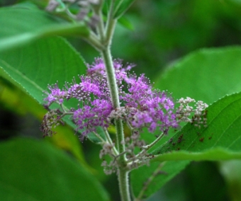 Voici un beau et peu commun Callicarpa. Il a de grandes feuilles allongées, larges et très duveteuses comme celles de Callicarpa rubella. Au printemps, ses inflorescences portent des fleurs mauves. C'est un petit arbuste qui a été collecté dans les montagnes du Vietnam à 1000m d'altitude. Il sera donc à réserver aux jardins situés dans les régions clémentes ou, comme chez nous, à la culture en pot en serre froide. Il a supporté -8°C sur une courte période. Nous ne l'avons pas encore testé à tes températures inférieures. Une belle plante en tout cas.